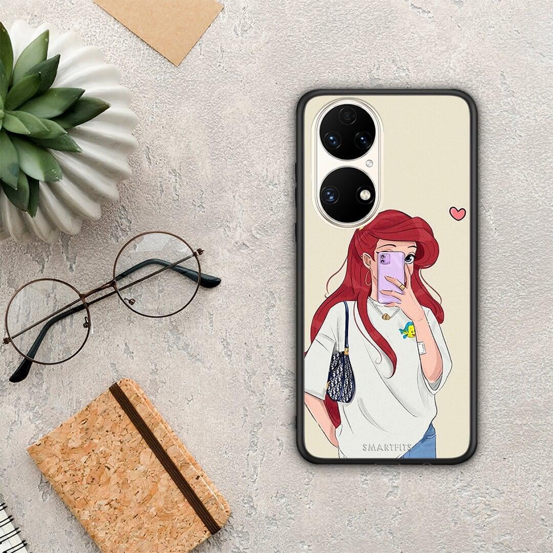 Θήκη Huawei P50 Walking Mermaid από τη Smartfits με σχέδιο στο πίσω μέρος και μαύρο περίβλημα | Huawei P50 Walking Mermaid case with colorful back and black bezels