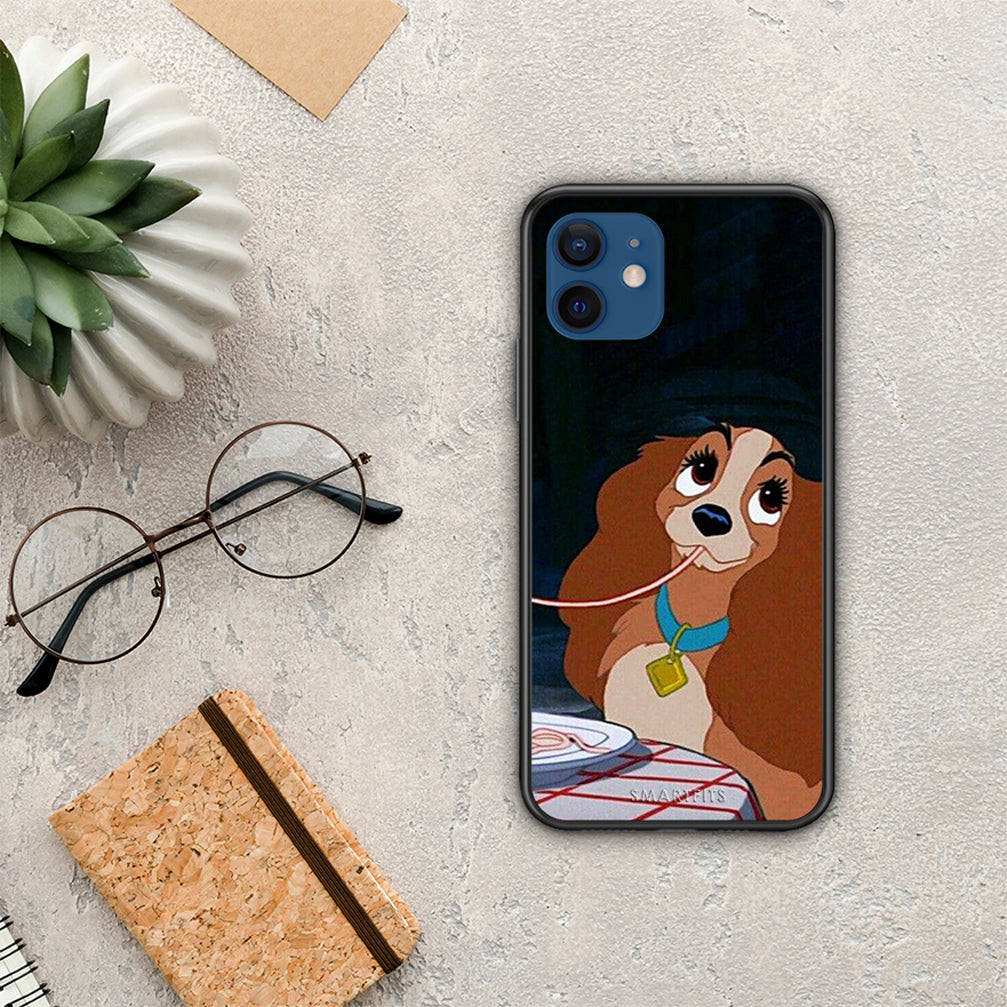 Θήκη Αγίου Βαλεντίνου iPhone 12 Lady And Tramp 2 από τη Smartfits με σχέδιο στο πίσω μέρος και μαύρο περίβλημα | iPhone 12 Lady And Tramp 2 case with colorful back and black bezels