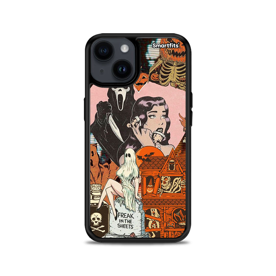 Θήκη iPhone 14 Plus Halloween Collage από τη Smartfits με σχέδιο στο πίσω μέρος και μαύρο περίβλημα | iPhone 14 Plus Halloween Collage case with colorful back and black bezels
