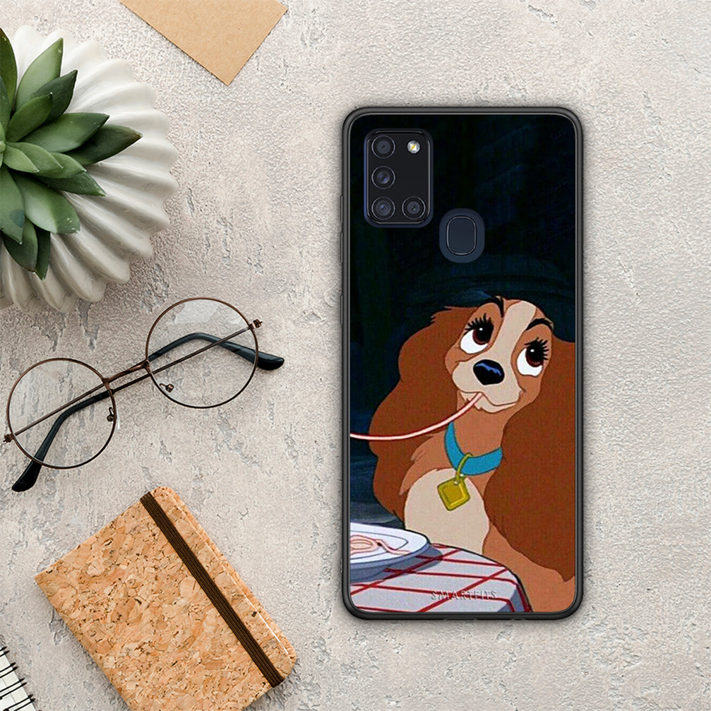 Θήκη Αγίου Βαλεντίνου Samsung A21s Lady And Tramp 2 από τη Smartfits με σχέδιο στο πίσω μέρος και μαύρο περίβλημα | Samsung A21s Lady And Tramp 2 case with colorful back and black bezels