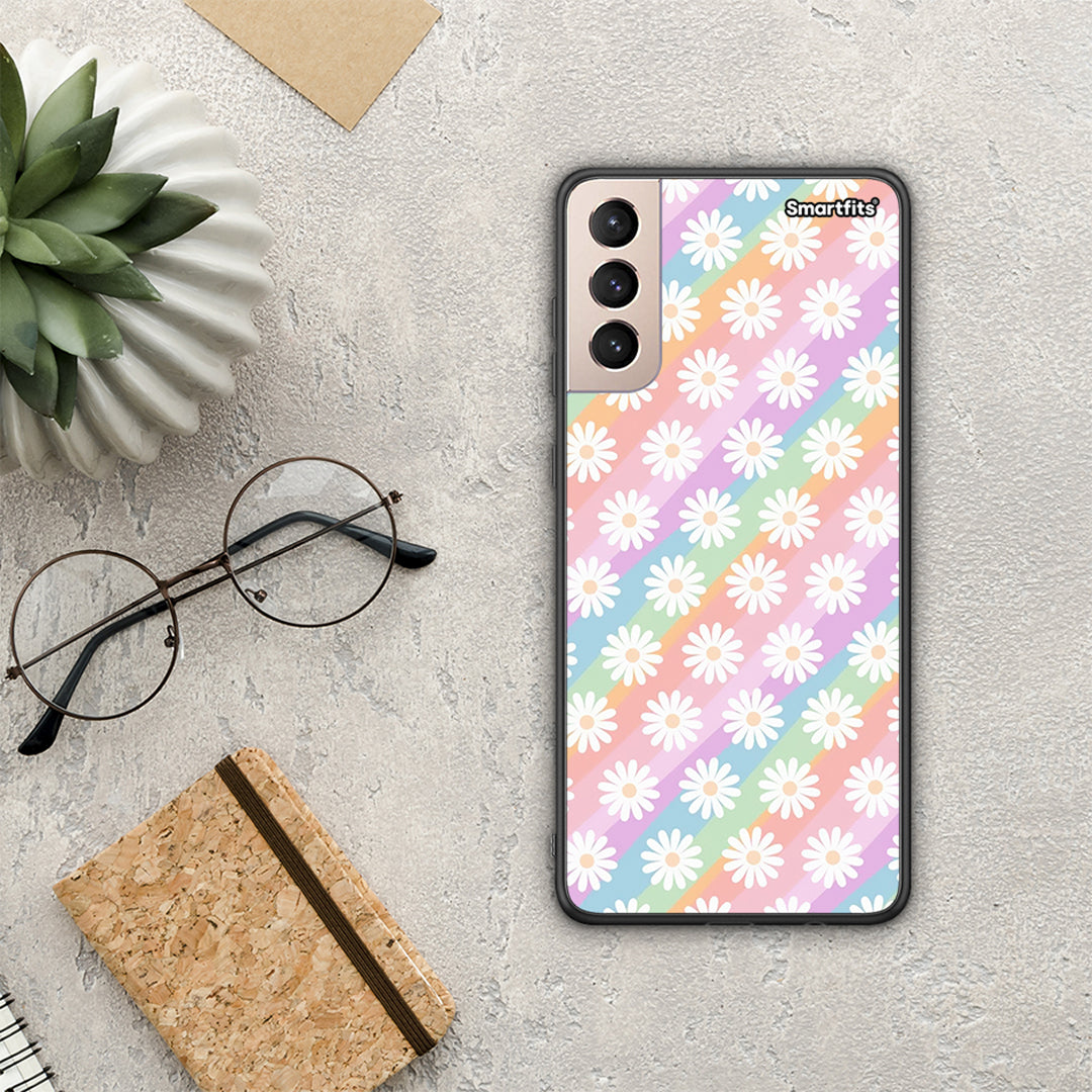 Θήκη Samsung S21+ White Daisies από τη Smartfits με σχέδιο στο πίσω μέρος και μαύρο περίβλημα | Samsung S21+ White Daisies case with colorful back and black bezels